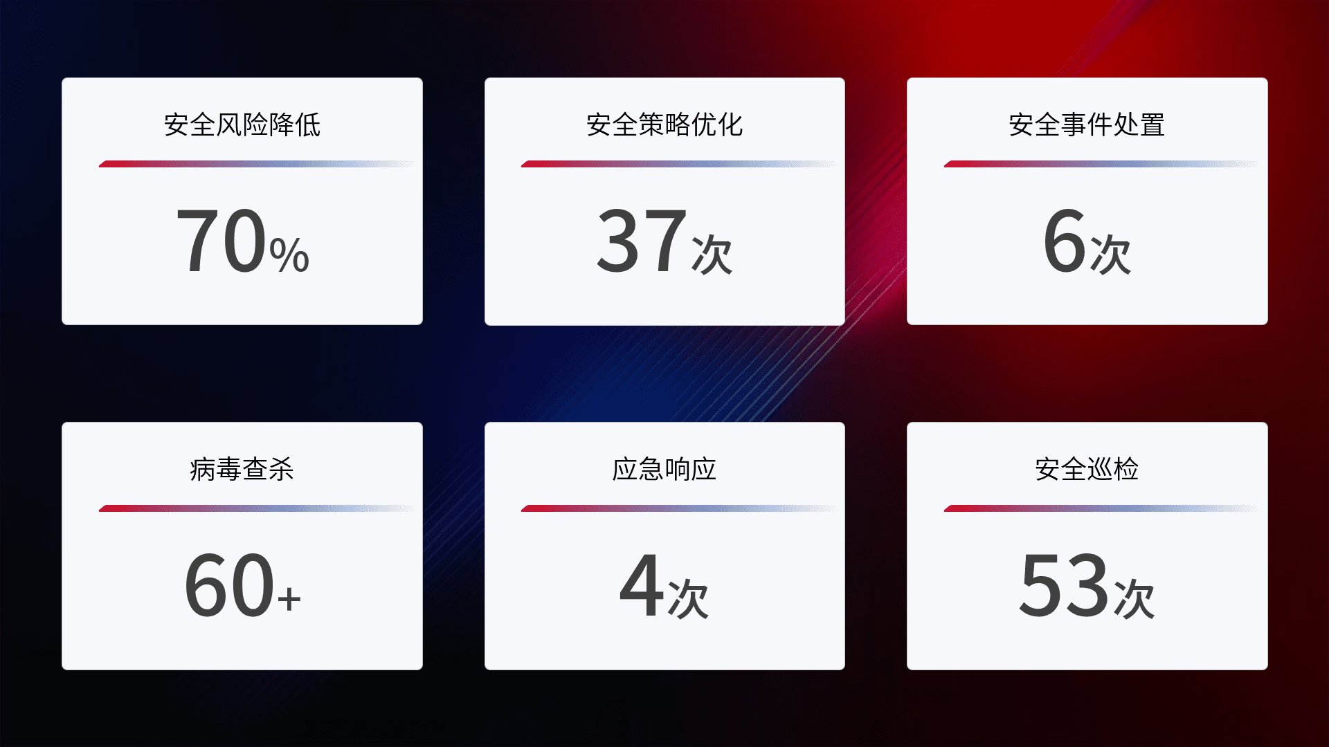 提供全面的安全事件报告体系,,,,包括处置报告、、周报、、季度和年度总结,,,,结合持续监控,,帮助客户深入了解网络安全状况。。。。